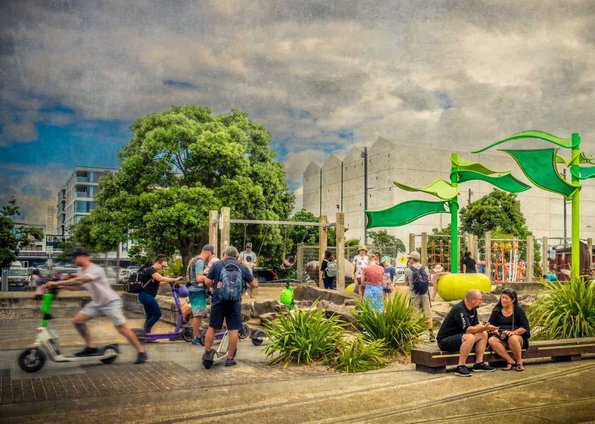 The. delightful surprise is the amount of space Wynyard Quarter devotes to family-friendly places. From the expansive Silo Park playground rendered in this image to the numerous pocket parks and water features that populate the district, Wynyard Quarter attracts scores of families on weekends throughout the year.