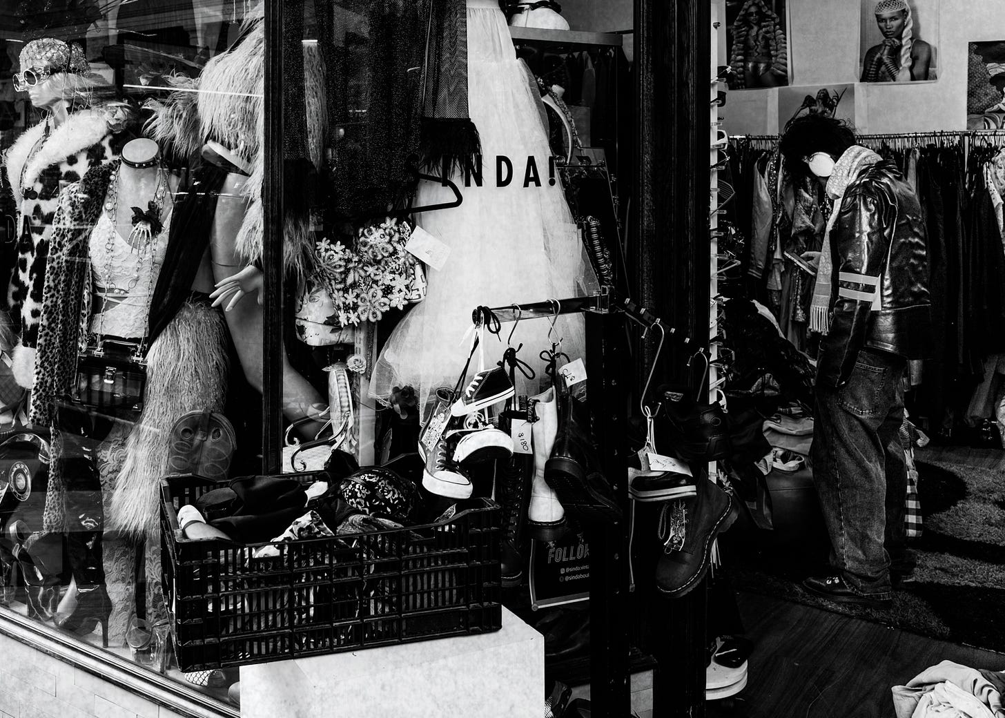 The shop window of the clothing purveyor in today’s image is the display equivalent of so many circus clowns packed into an undersized car. It is a garment and fashion riot.
