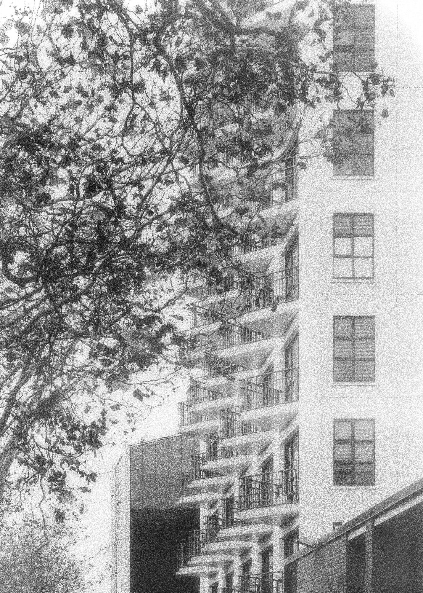 Taking the time to walk within a deliberate arc across the front facade of an apartment building, an otherwise unexceptional structure, reveals the veiled caress of leaf and cement. It is an intimate embrace, the gentle movement of hand on cheek.