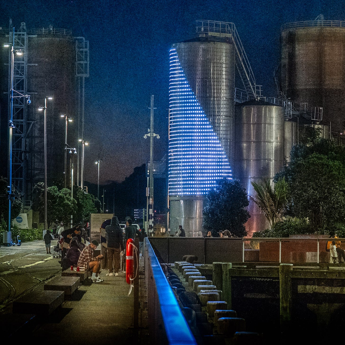 As I approached Silo Park from the eastern boundary of Wynyard Quarter, I was enchanted by the bluish halo on the waterfront railing reflected from the lights of the art installation beyond it.