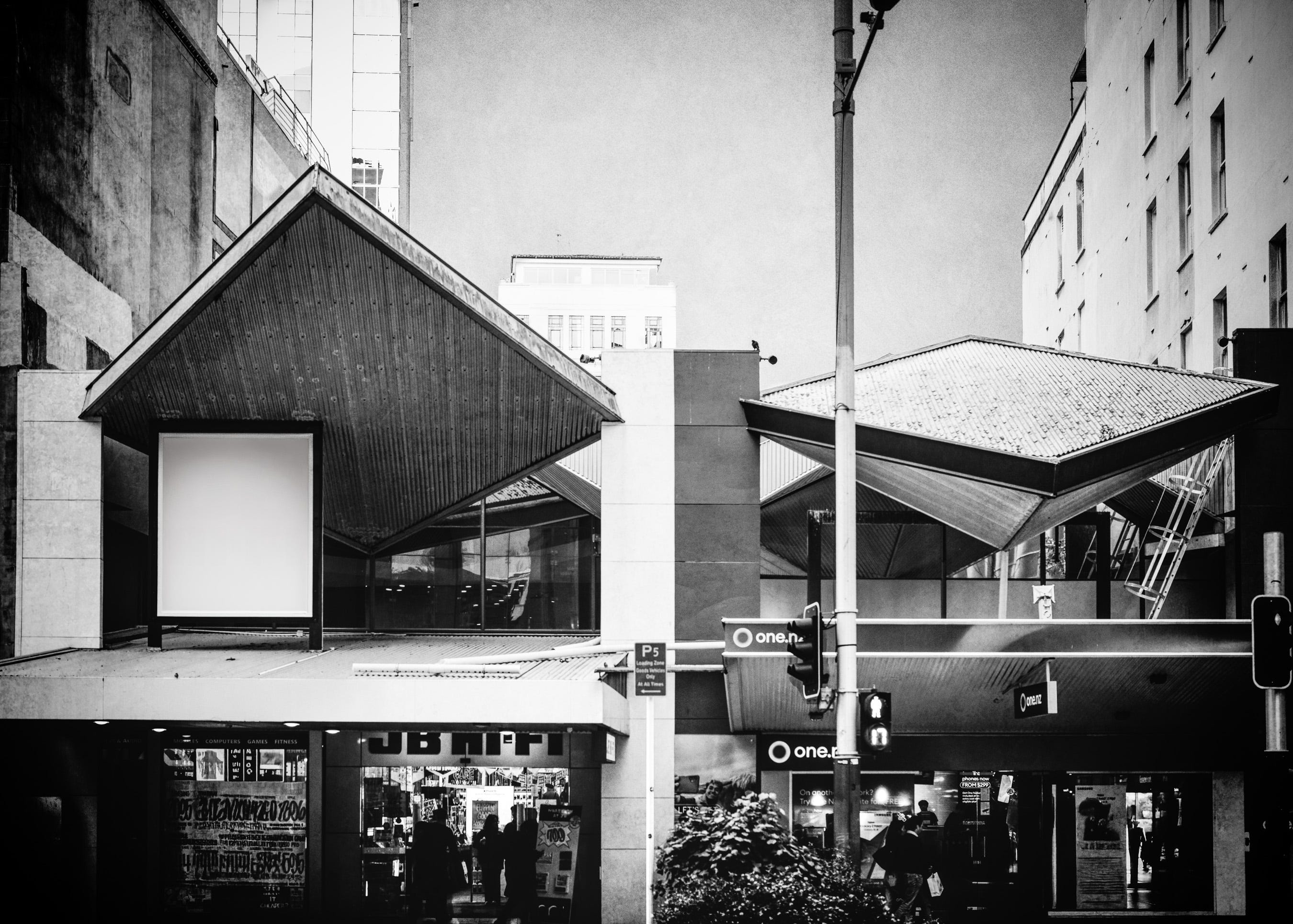 The rooftops at 126-128 Queen Street stand out not so much because they are icons of a Modernist style, but more so because these geometric forms on dynamic and oblique axes are brashly discordant amidst the refined and settled structures of a previous century’s sensibility that otherwise populate the northern-most blocks of Queen Street.