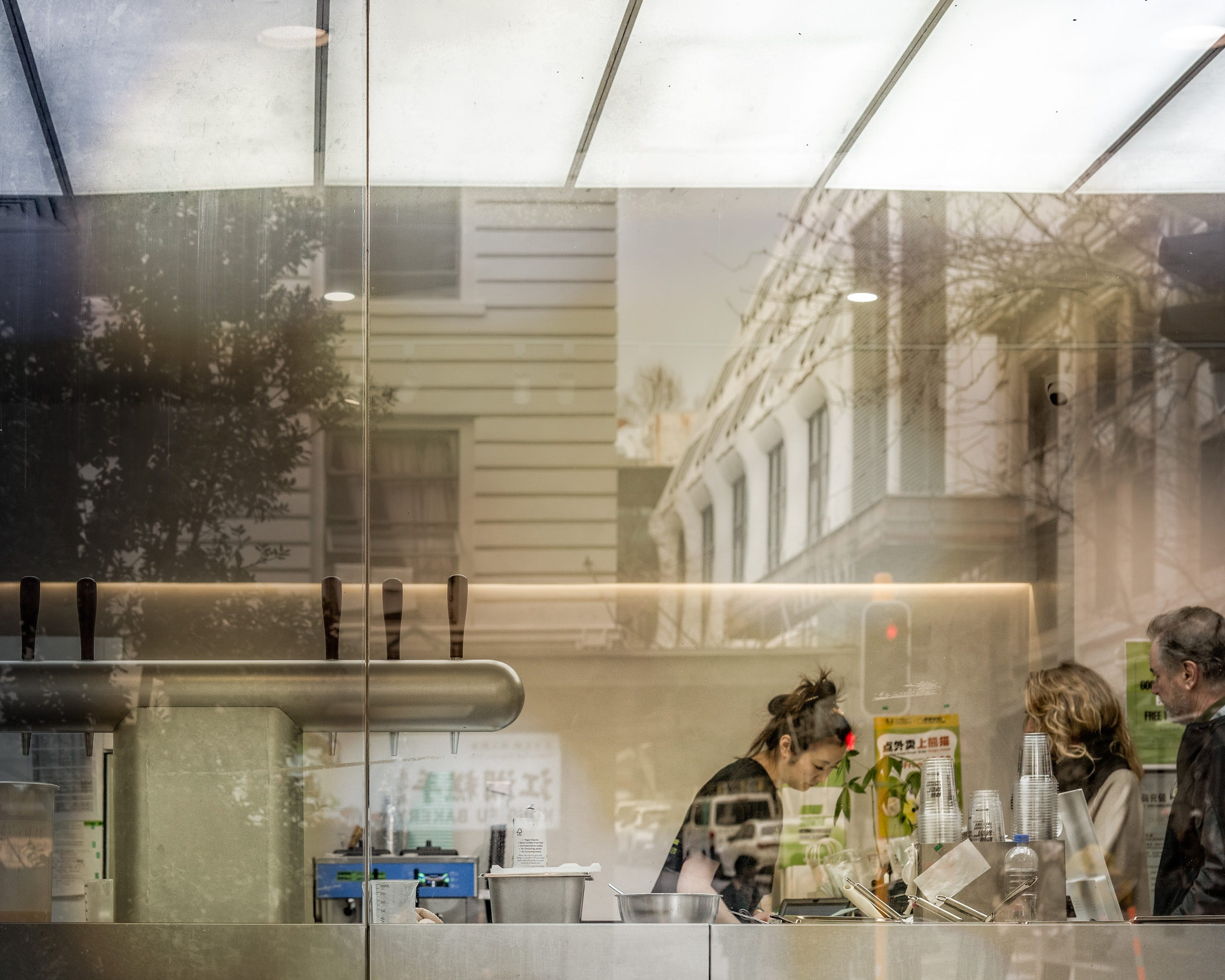 I deliberately cropped the image to force the emotionless subjects, a server and her two customers, into a corner of the frame. I attempted to heighten that sense of disquieted isolation and constraint by suggesting that the image frame was insufficiently spacious to accommodate the partner of the female customer. We see only a partial view of him as if all three have been enclosed within a space too small to comfortably fit them.