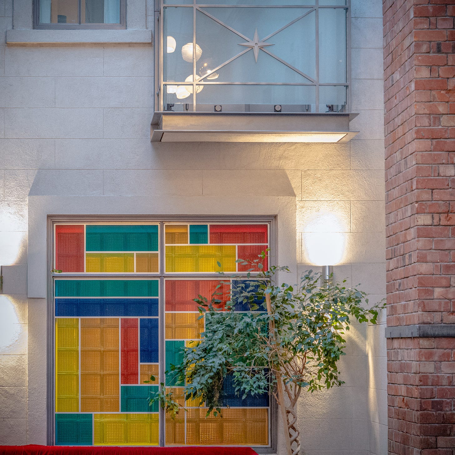 The Art Deco touch of metal ornamentation on the entrance doors, with its striking overlay of line and curve, along with the parade of geometrically assorted and colour arrayed ceiling lamps within the reception lobby, are stellar highlights within this entry’s photograph.