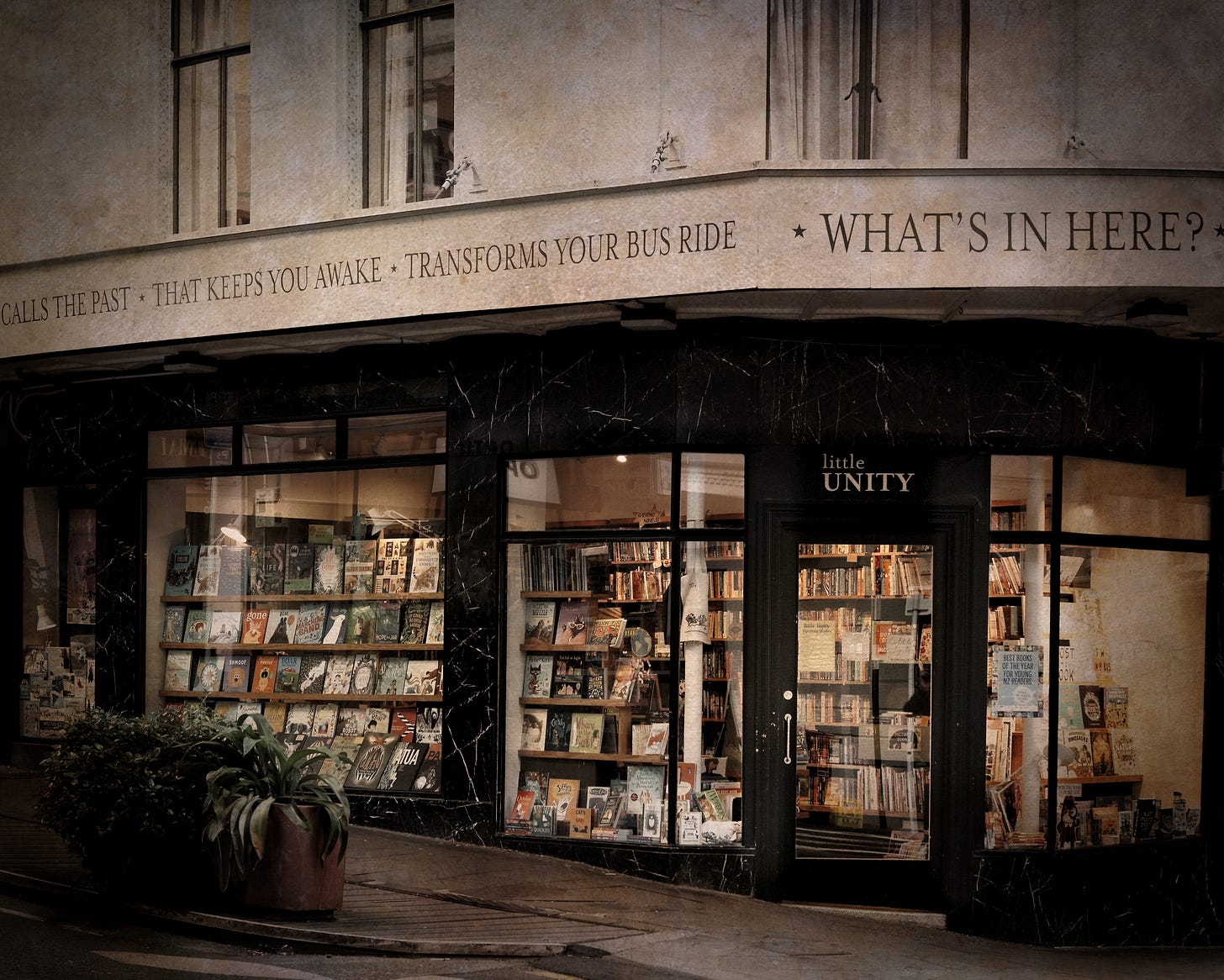 With the highly stylised photograph of today’s entry, rich in layered textures, I have attempted to convey visually my love of a storied book shop in after-hours light, always a fantastical moment in the cycle of a day.