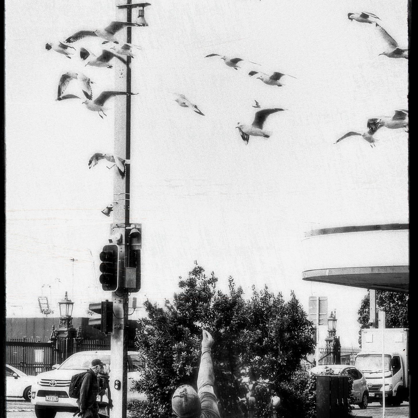 It is a scene from any oceanfront city - sea gulls accustomed to finding food sources, healthy or otherwise, at oceanside spaces where people hang out. Today’s entry captures one of those interactive moments between a flock of gulls and a self-anointed caretaker.