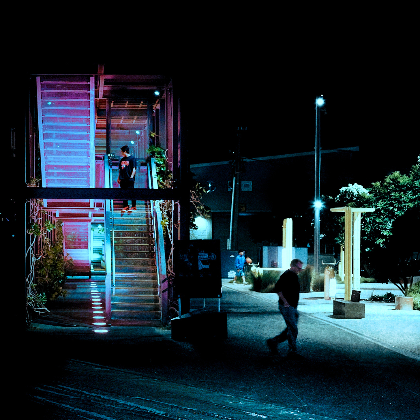 The celestial light and shadow of daytime gives way with nightfall to the artifice of unnatural illumination, both sublime and garish.