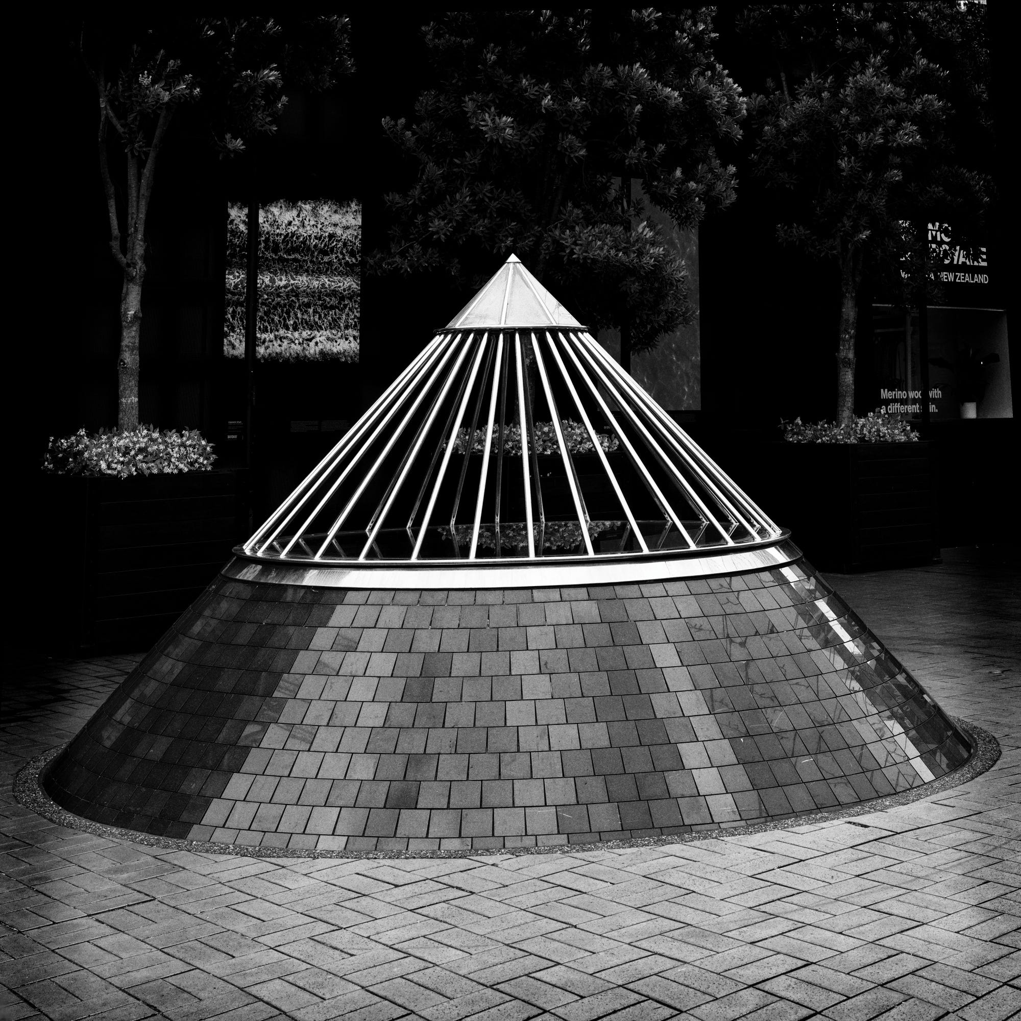 Which brings me to the subject of today’s photographic entry: one of the architectural skylights of an array that bathe with light the underground train platforms of Waitematā (originally named Britomart) Station in city-centre Auckland. In the waning years of the 20th century, as architects thought about design themes for the construction of underground train platforms within Britomart Train Station, they designed the skylights to mimic the form of volcanic cones.