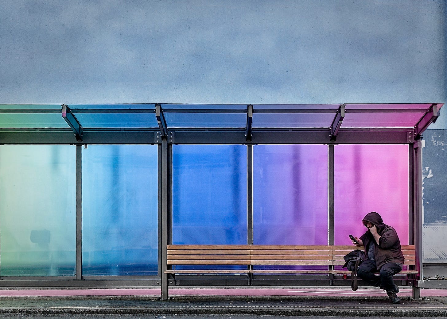 The rainbow bus stop, located on Karangahape (K) Road in Auckland, was constructed as part of the rainbow path project within the K Road transport improvement programme. The K Road rainbow path acknowledges and celebrates the centrality of diversity and inclusion within the histories of K Road residential, civic and business communities.
