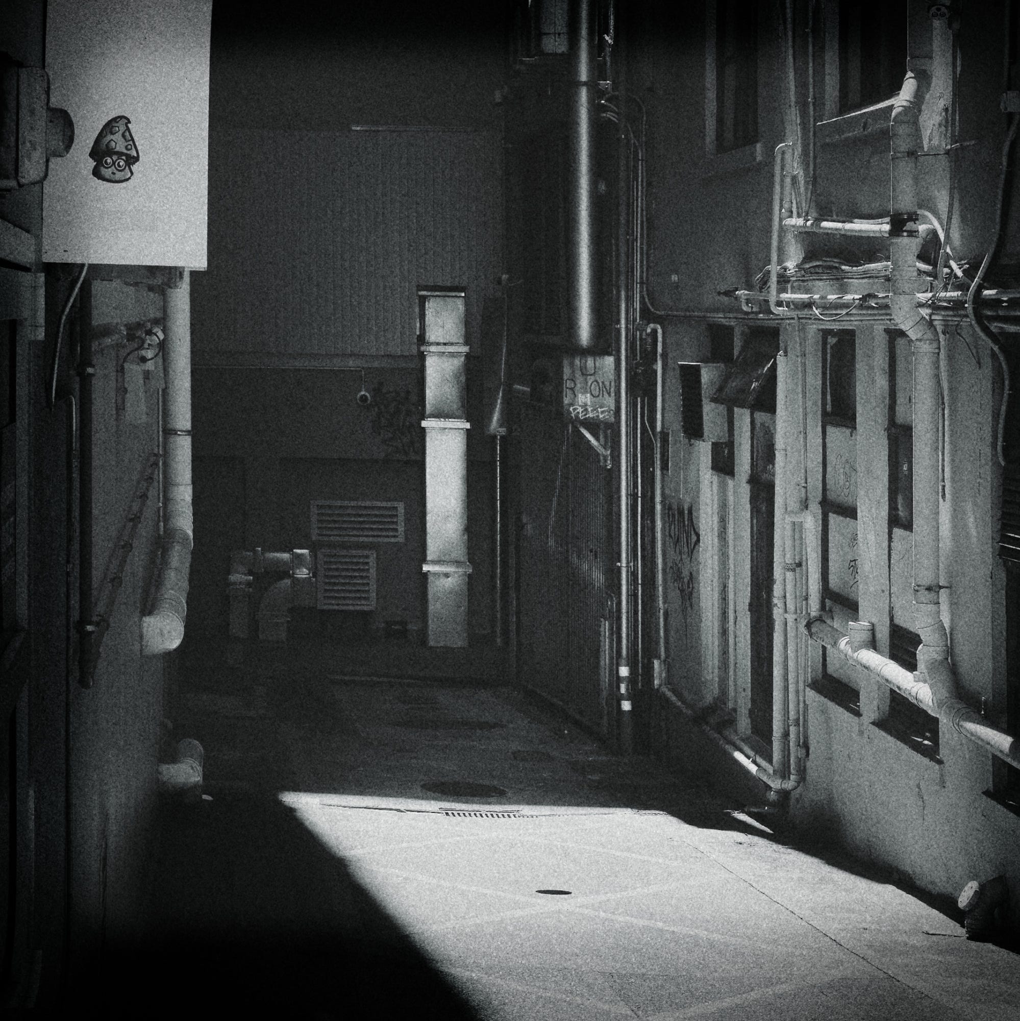 Like the Renaissance artists who employed chiaroscuroto to create depth, focus and dramatic tension in their paintings, time has applied soot and grime to this urban canvass and presented a possibility that utilitarian pipe, vent and chimney might be seen as evocative visual artefact.