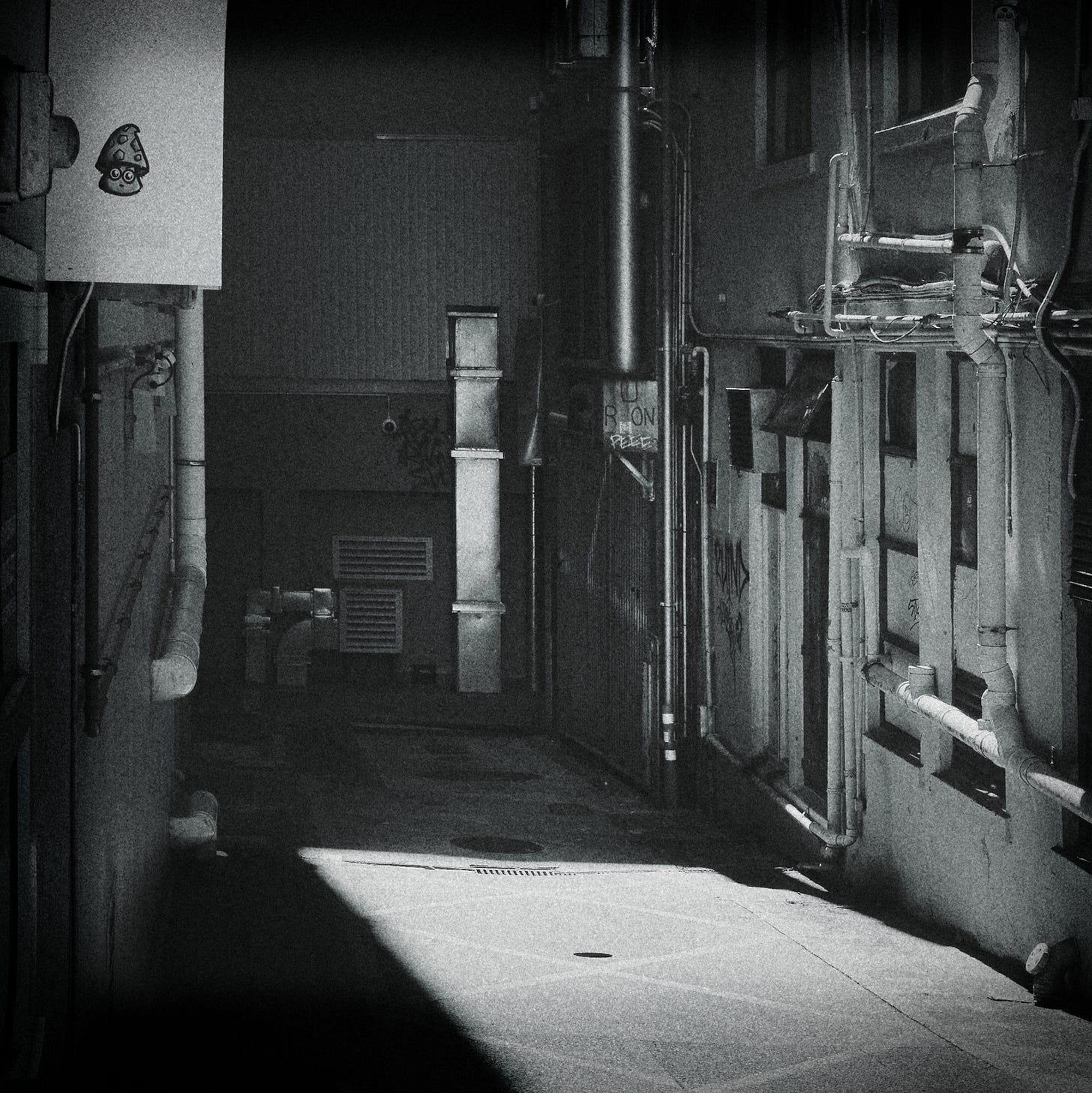 The beauty in this photograph, if one concedes that beauty lies within it, is not inherent in the objects scattered across the alley way. By most aesthetic conventions, these elements of infrastructure are prosaic, perhaps curious, but hardly the stuff of artistic celebration. I suspect few stop, as I did, to admire the subtle wonder I found here.