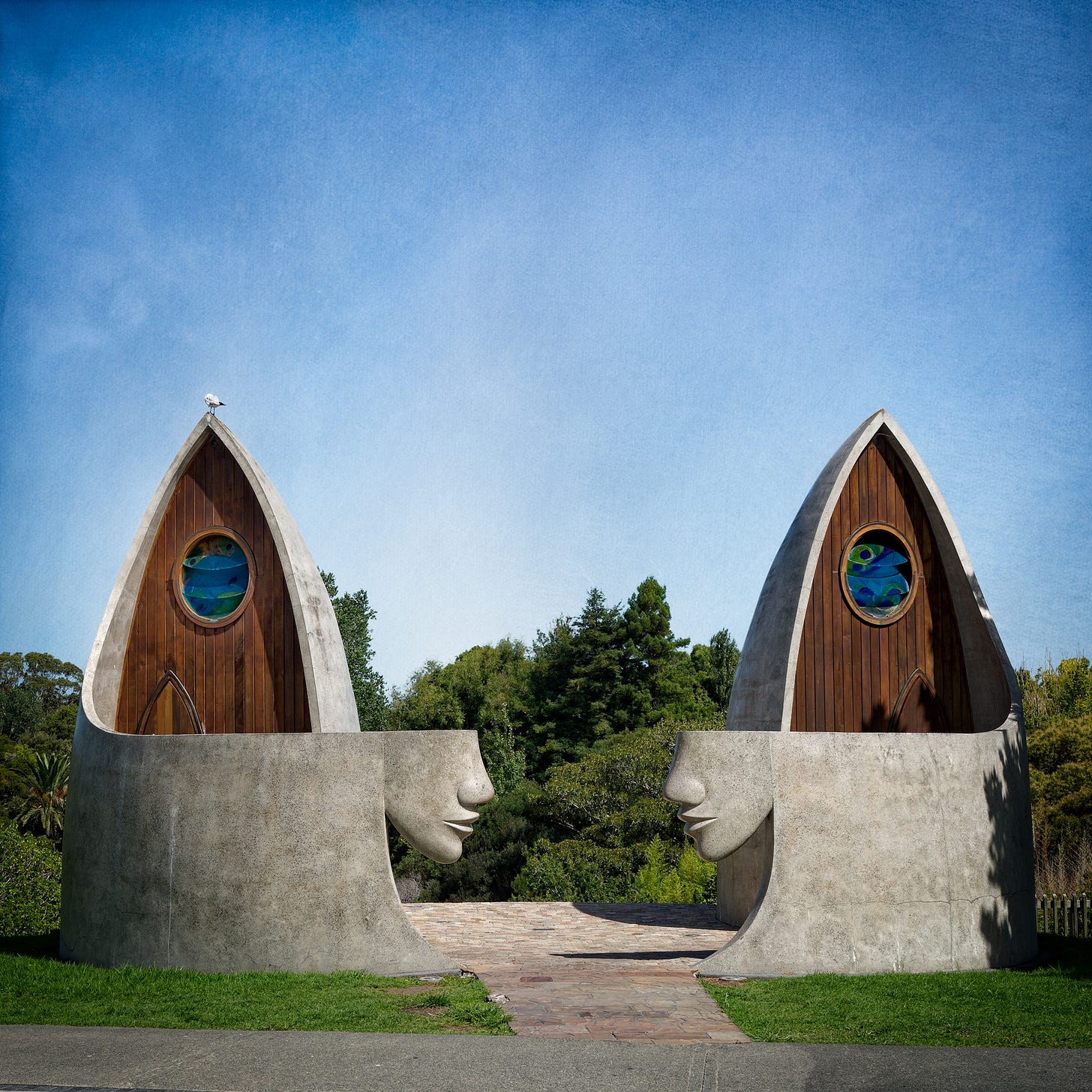 In the North Auckland village of Matakana, local artist Stephan de Haan won a design competition (circa 2002) for the construction of a public toilet. Taking inspiration from the boat construction tradition of the area, de Haan’s design echoes the shape and materiality of twin boat hulls. With curvaceous elegance, a pair of cement walls form the entrance way. And, as its crowning design achievement, a pair of cement facial profiles appoint the entrance way.