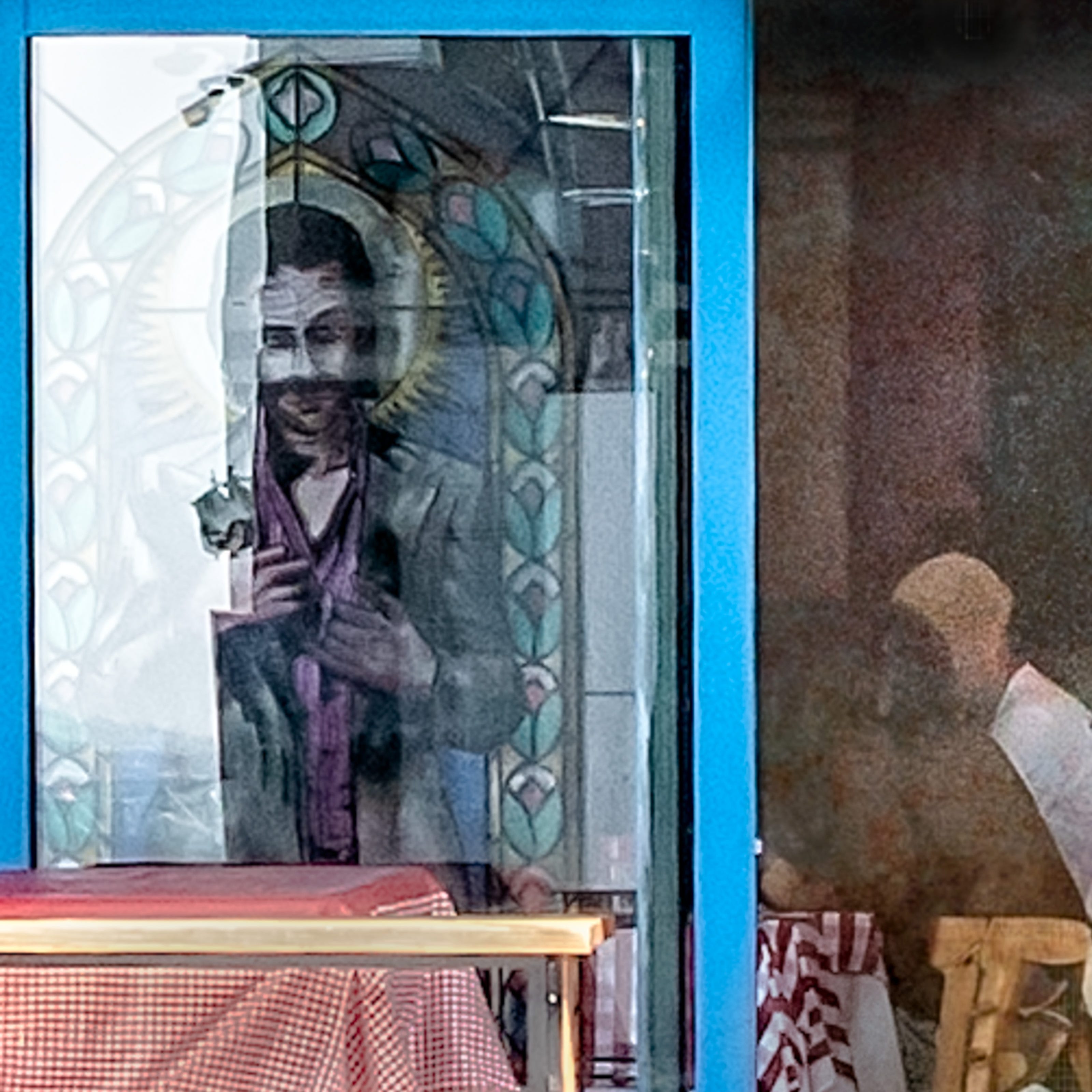 A saintly depiction in stained glass of the Australian musician Nick Cave sits within the restaurant some distance from the front window. The reflctive distortion of the exterior light against the window, however, makes it appear that the stained glass mural is superimposed eerily on the surface of the glass. The art work anchors the bohemian mood of the interior, but — from the outside — it exudes an other-worldly radiance.