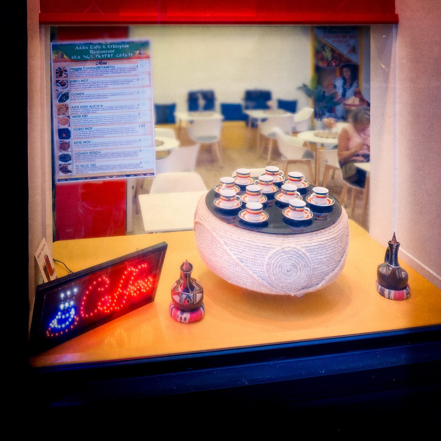 The cafe window at the Addis Cafe and Ethiopian Restaurant plays on the Kiwi addiction to excellent, if not also exotic, coffee. The demitasse coffee cup signals just that: the coffee will be small-portioned but full bodied. The message is brilliant: complex and layered flavours are best sipped slowly, are best savoured.