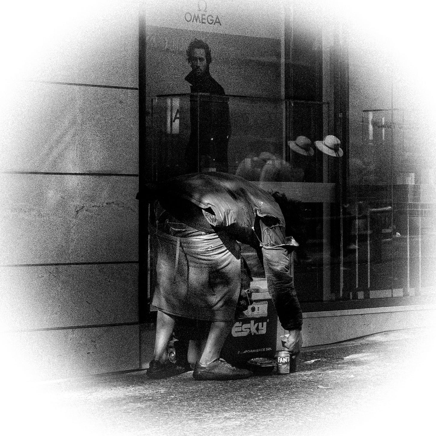 I am also the partner who sets the dinner table, an easy task when place settings are limited to two persons, but the chore is within my dinnertime remit. Therefore, I was especially attentive when I saw the gentleman featured in today’s photograph begin to set his table, a reclusive edge of a pedestrian lane that connects Queen and High Streets. His Fanta drink marked one edge of his table, followed by the makings of his mains - a collection of fast food favourtites - gingerly placed in other quadrants.